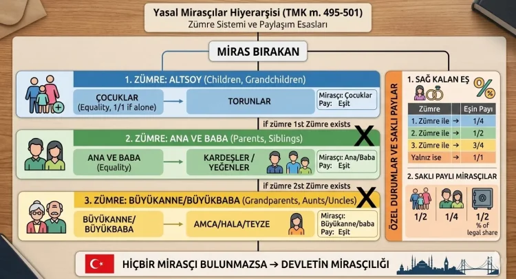 Türk Medeni Kanunu m. 495 uyarınca yasal mirasçılık sistemi kan hısımlığına dayanır. Birinci zümre olan altsoy miras bırakanın çocuklarını ve torunlarını kapsar. Lakin altsoy bulunmadığında miras hakkı m. 496 gereği ana ve baba zümresine geçer. Üstelik kanun koyucu aile birliğini korumak amacıyla mülkiyeti aile içinde tutar. Dolayısıyla zümreler arası öncelik kuralları sayesinde terekenin kimlere kalacağı yasal olarak netleşir. Aslında bu hiyerarşi mülkiyet hakkını aile içinde tutan en temel hukuki güvencedir.