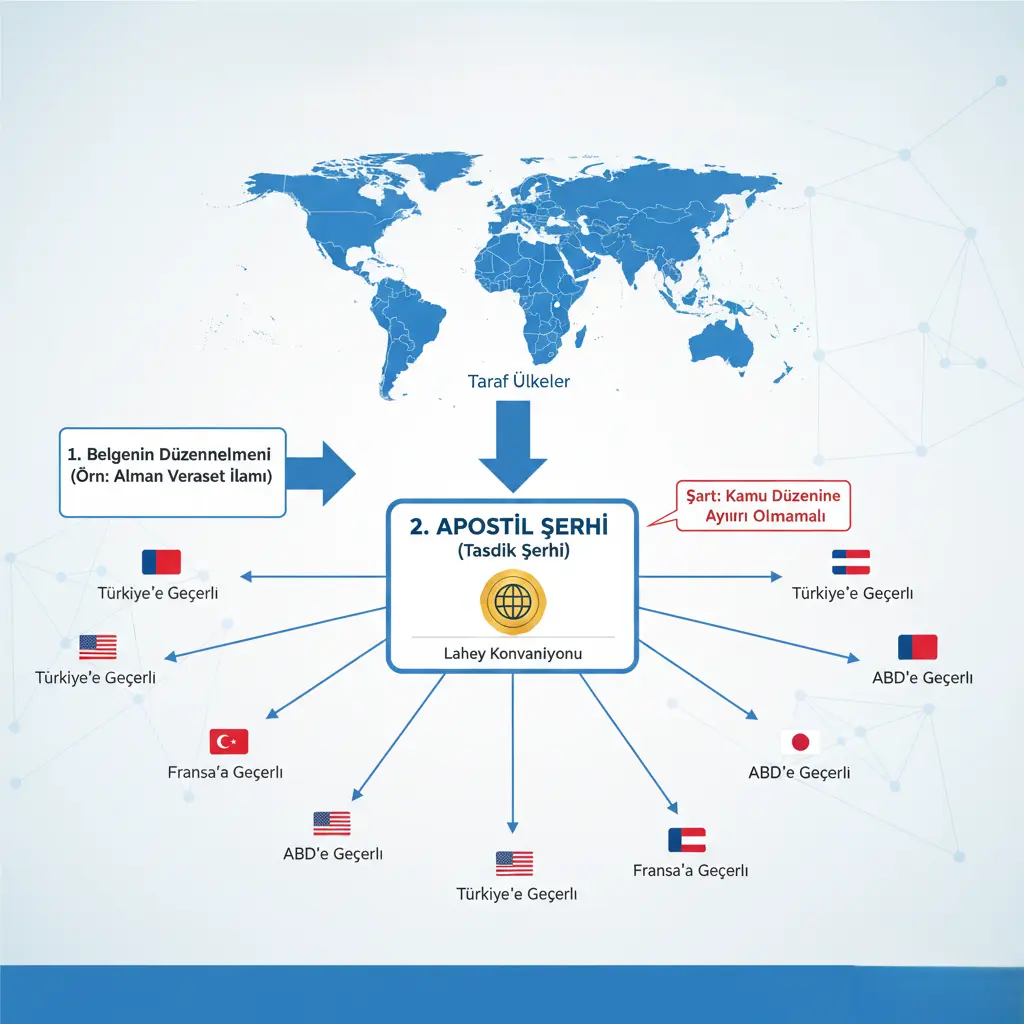 Miras uyuşmazlıkları çözümünde uluslararası sözleşmeler iç hukuk kadar büyük önem taşır. Üstelik Türkiye ile Almanya arasındaki hukuki bağlar çeşitli anlaşmalara dayanmaktadır. Bu sebeple 1961 tarihli Lahey Apostil Sözleşmesi süreçlerin ana eksenini oluşturur. Sözleşme sayesinde yabancı resmi belgeler Türkiye’de doğrudan hukuki geçerlilik kazanır. Böylece Alman makamlarının verdiği veraset belgelerini ek onay almadan kullanabilirsiniz. Ancak bu belgelerin içeriği Türk kamu düzenine mutlaka tam uyum sağlamalıdır. Zira kanunlar ihtilafı kuralları ile sözleşme hükümleri bir bütünlük arz eder. Ayrıca devletlerarasındaki hukuki karşılıklılık ilkesi mirasçıların hak arama özgürlüğünü korur. Sonuç olarak her adım uluslararası hukuk normlarının sağladığı güvenle ilerlemektedir.
